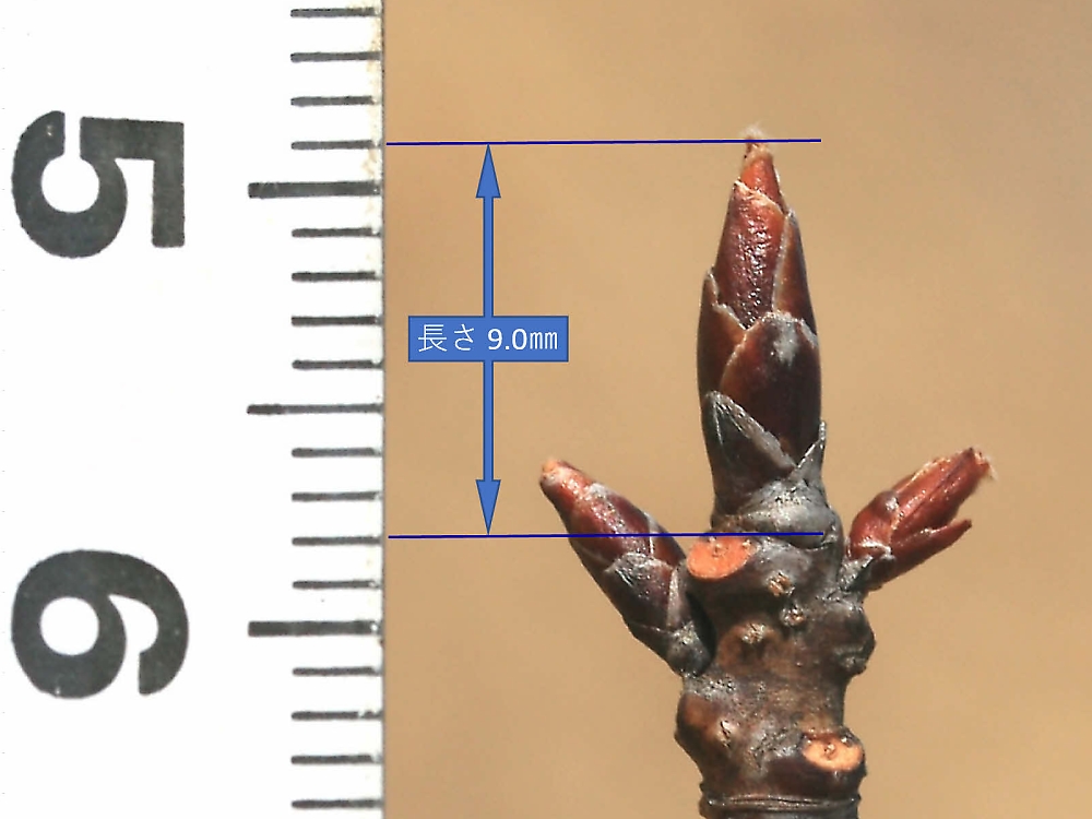 MEMO: 大寒桜の冬芽で、円錐形で、長さ 9.0 ㎜と長い品種であり、 早咲き品種のため、わずかに冬芽が膨らみかけているようにも見える