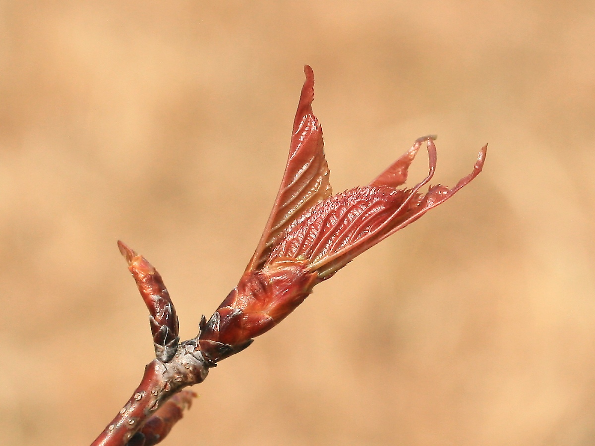 MEMO: 冬芽(葉芽)から紅褐色の葉がではじめたところで、 今のところこの状況でもつぼみがでる花芽は確認できていない