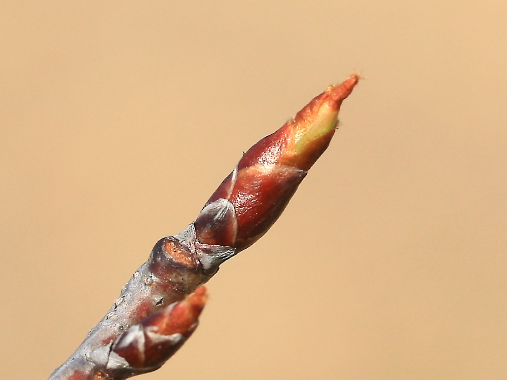 MEMO: ここにきてやっと遅れ冬芽が膨らみ、先端に黄緑色や紅色が見えてきた ところで、冬芽の形からこの芽は、葉や枝が出てくる葉芽(ようが)のようである