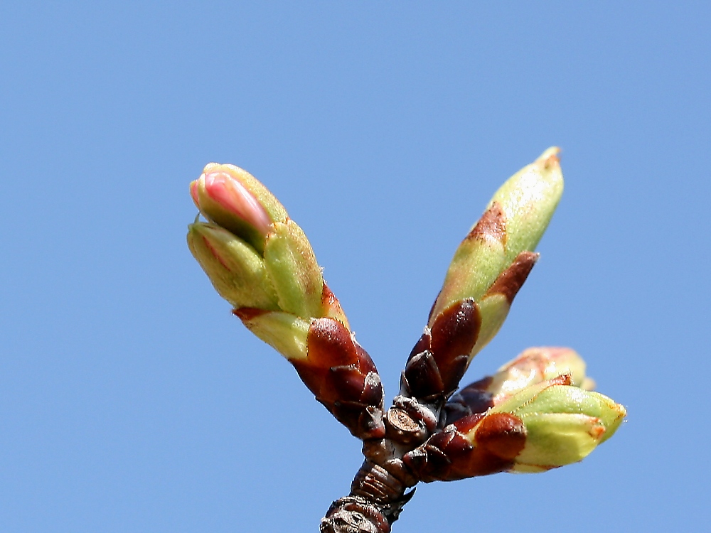MEMO: 蕾が出始めた大島桜の花芽で、蕾から顔を見せている花弁が 淡紅色であり、右の葉芽からはまもなく葉が出初めてくるのが特徴である
