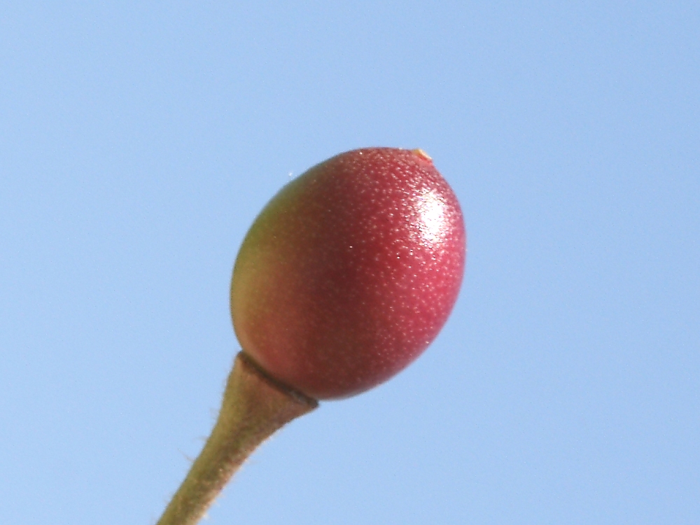 MEMO: 結実した大島桜の実で、色も赤くなっており、熟し始めたところで、 この先、実は赤熟するが完熟するまでにほとんどが落果してしまう予想である