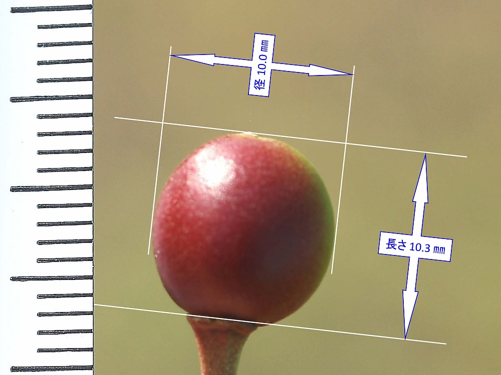 MEMO: 大島桜の実の大きさで、長さが 10.3 ㎜で、直径が 10.0㎜ (長さの97%)とほぼ球形になり、熟し度を増しているところであるが、 この先、実は赤熟するが、完熟するまで落果せずにいるかが不安である