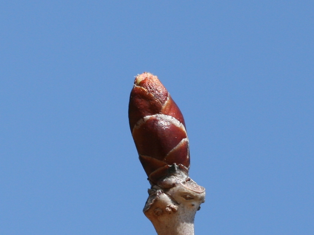 MEMO: 膨らみ始めた大山桜の冬芽で、先端が割れ、 わずかに淡黄緑色や淡紅色が見え始めてきたところ