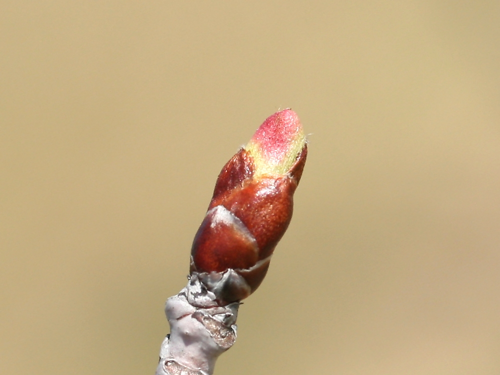 MEMO: 膨らみが増した大山桜の冬芽で、 先端が割れ、鮮やかな紅色が見え始めたところ