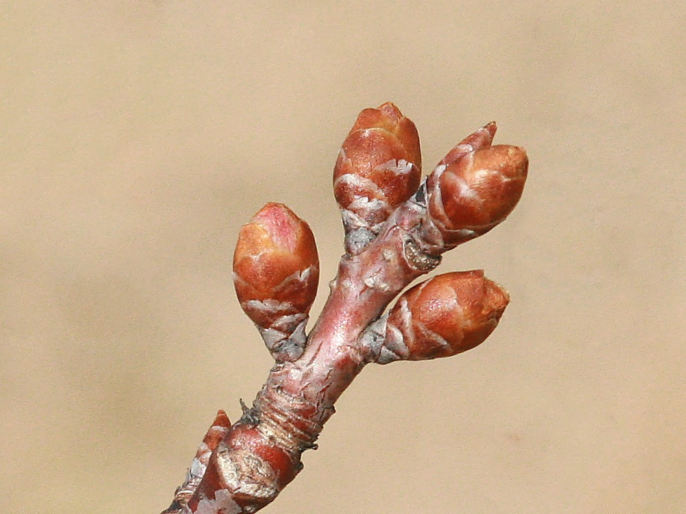 MEMO: 膨らみ始めたオカメの冬芽で、左下の冬芽の先端が割れ、 淡紅色がわずかではあるが見え始めているところである
