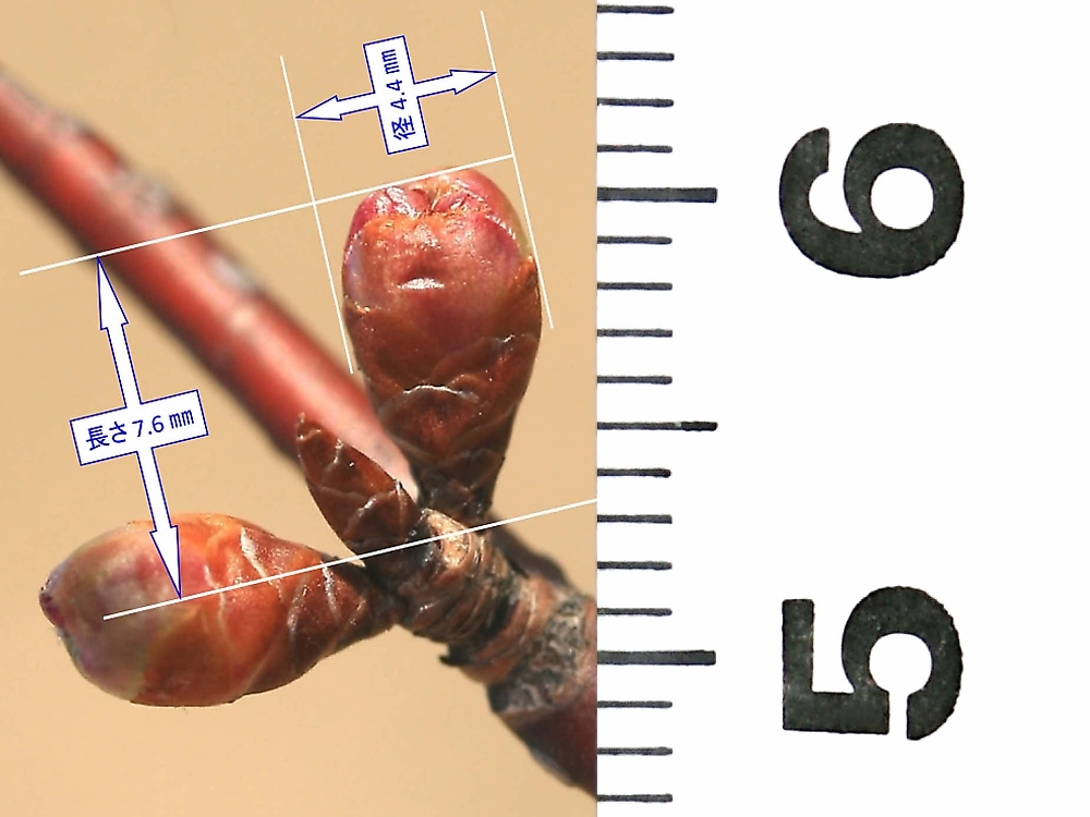 MEMO: 膨らんだオカメの冬芽で、逆円錐形まで膨らんで、大きく 見えるが、長さ 7.6 ㎜、径 4.4 ㎜と芽としてはやや小さめである