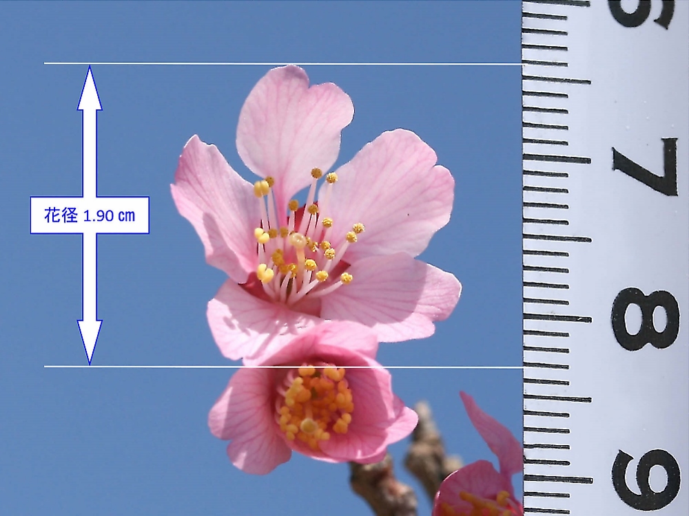 MEMO: オカメの花の直径で、1.9 ㎝程度と小輪であるが、 若木のうちから花が密集して咲くため、華やかさがある