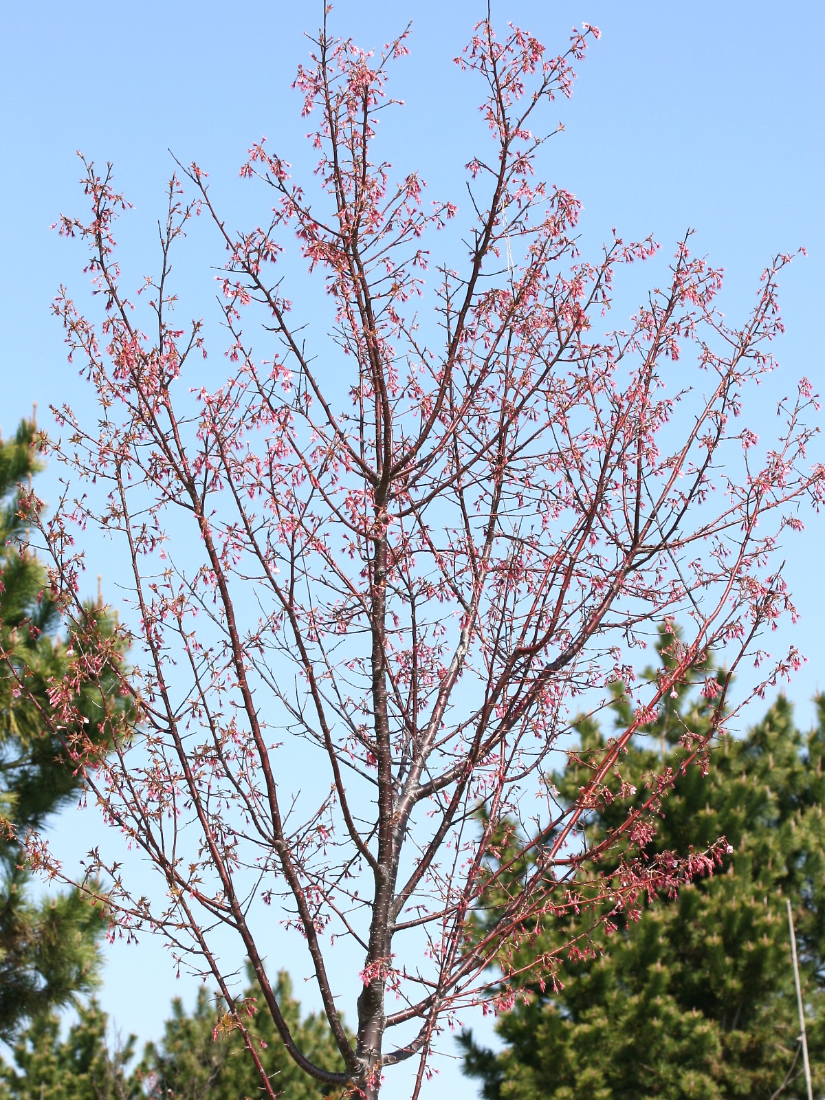 MEMO: 花時期が終了したオカメで、花弁が無くなり萼と雄しべだけになった 花が残り、まだ、葉はあまり出ていないので、赤い色が残っている状態である