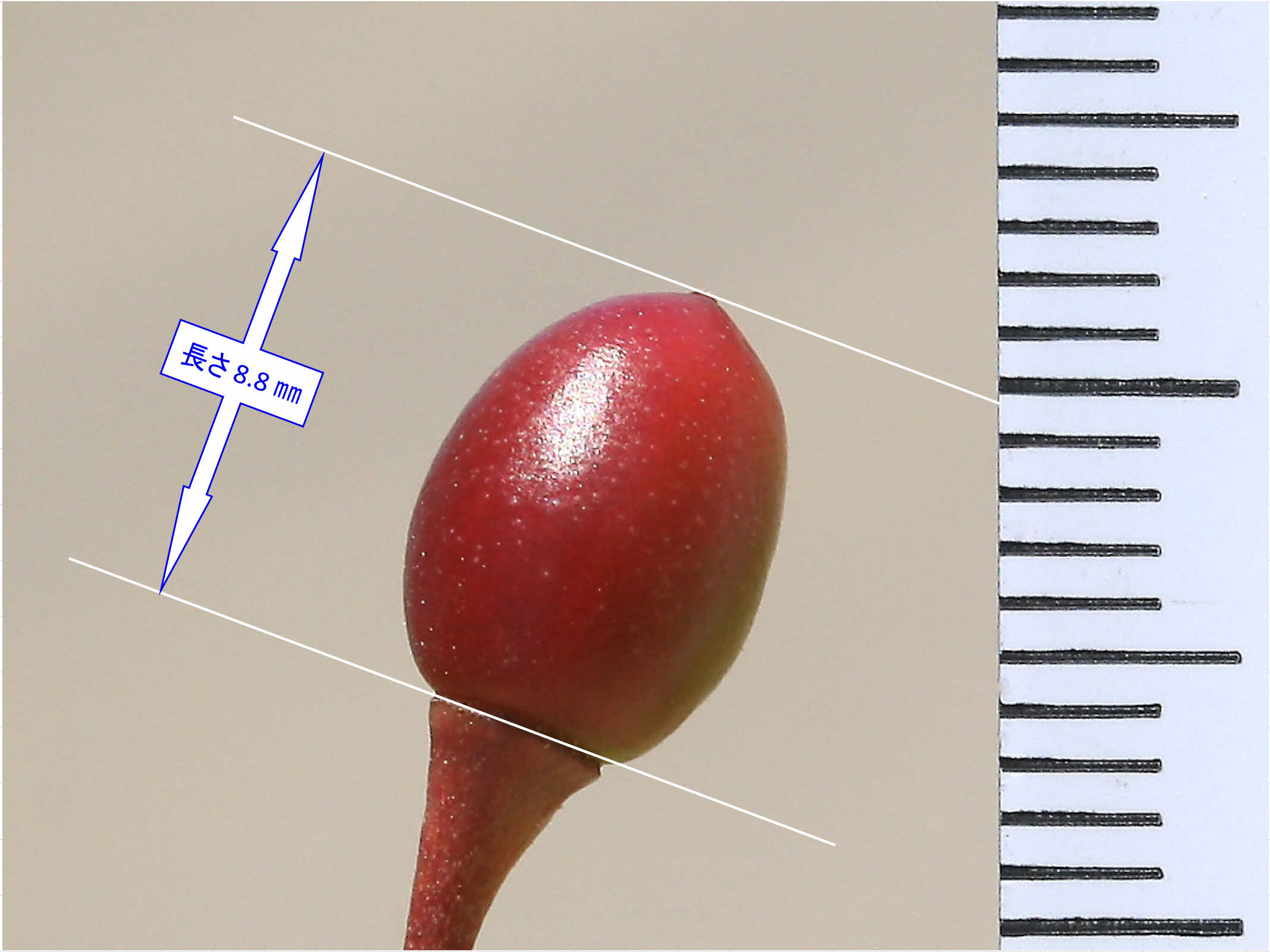MEMO: 結実して約1か月が経過したのオカメの実の長さで、 長さ 8.8 ㎜と殆ど変わりなく、成長が止まり熟してきているところ