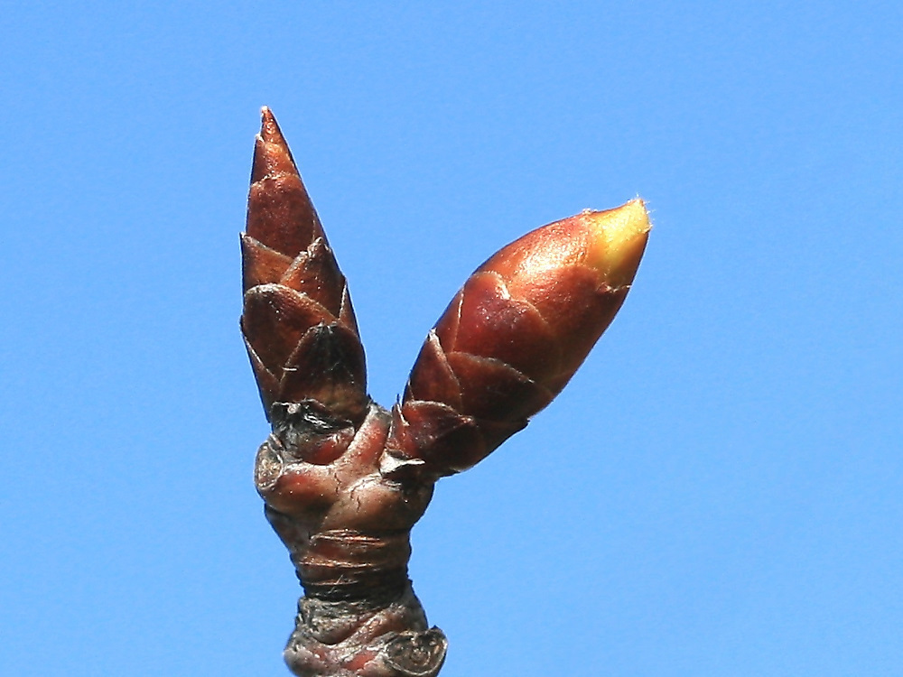 MEMO: 堅かった冬芽の鱗片が少し開き、冬芽が膨らみ始め先端に淡黄緑色が 見え始めたところであるが、木々によって進捗状況に大きな差がある