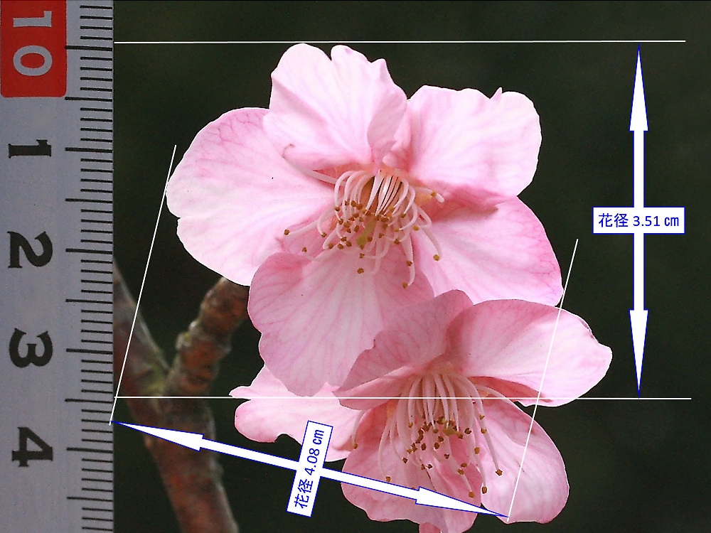 MEMO: 河津桜の花の直径で、約 3.5 ~ 4.1 ㎝の大輪であるが、 今の所はまだ咲き始めのため、3.5 ㎝以下の中輪の花が主体である
