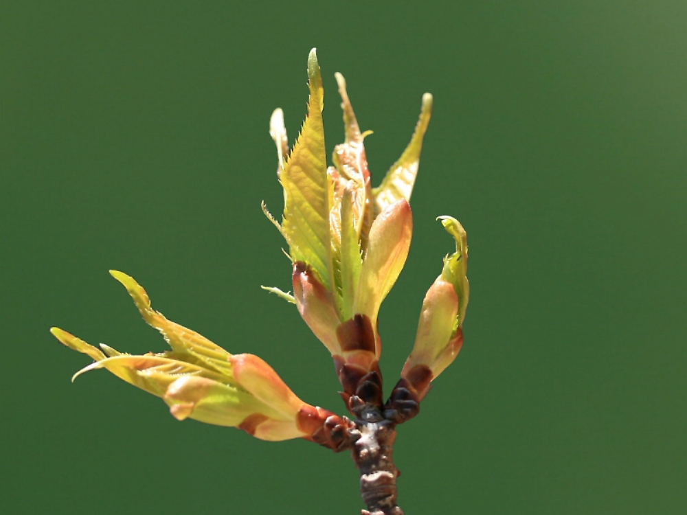 MEMO: 河津桜は満開になる前に葉が出始め、黄緑 か茶色がかった緑色の葉が、おもに枝先から出始める