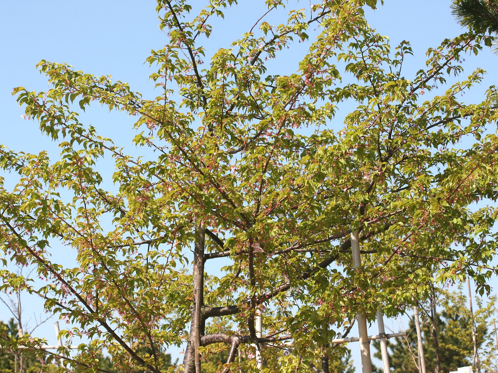 MEMO: 花時期が終了し、葉桜になった河津桜で、若葉が黄緑色である