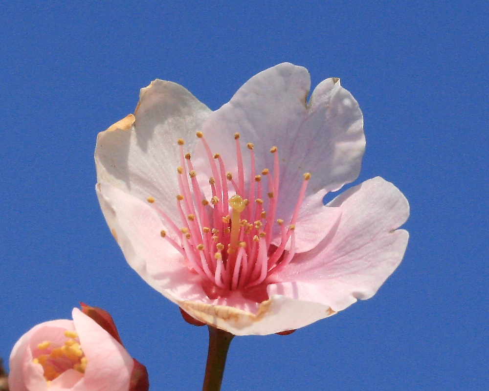 MEMO: 花時期の終わりが間近になった寒桜で、この時期になると多くの 桜がなるように、花弁の中心と雄しべが紅色に染まり、別の花姿を見せる