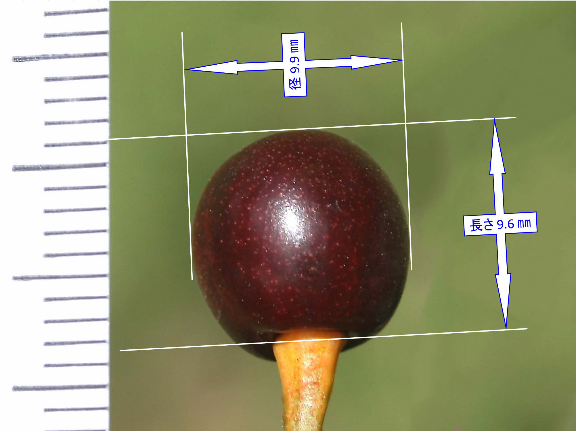 MEMO: 寒桜の実の大きさで、長さが 9.6 ㎜で、径が 9.9 ㎜ (長さの103%)と、径のほうが大きく、色も黒みも帯びており、 黒熟間近であり、黄熟実と赤熟実は完熟実ではなかったとがわかった