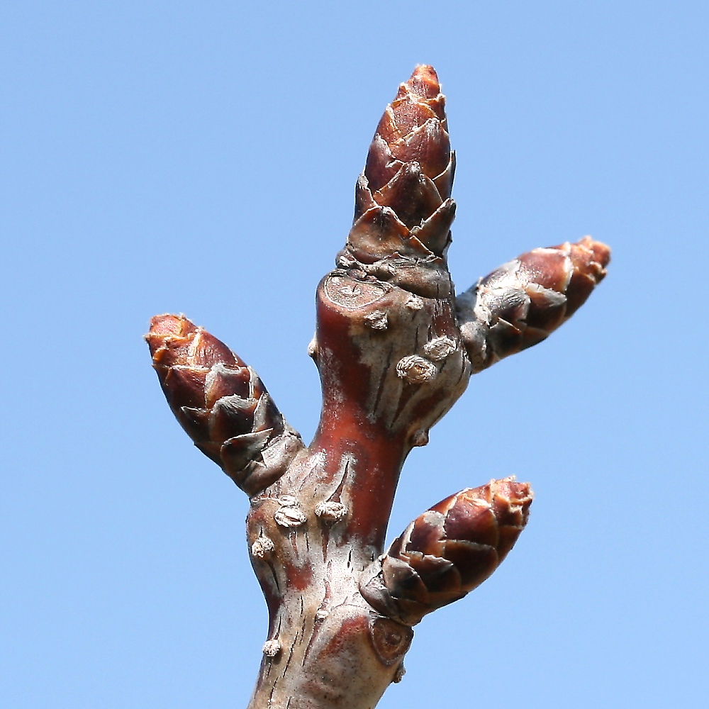 MEMO: 膨らみ始めた関山の冬芽で、先端がわずかに割れ、 かすかに淡紅色が見え始めてきたところ
