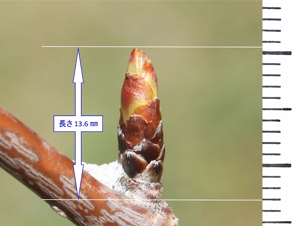 MEMO: 膨らみが増した関山の冬芽で、長さ 13.6 ㎜と非常に長くなったところ