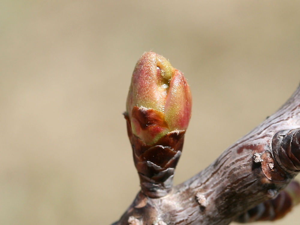 MEMO: 膨らみが更に増した関山の冬芽で、淡紅色や淡黄緑色の 先端が割れ、まもなくつぼみか葉が出始めてくるところ