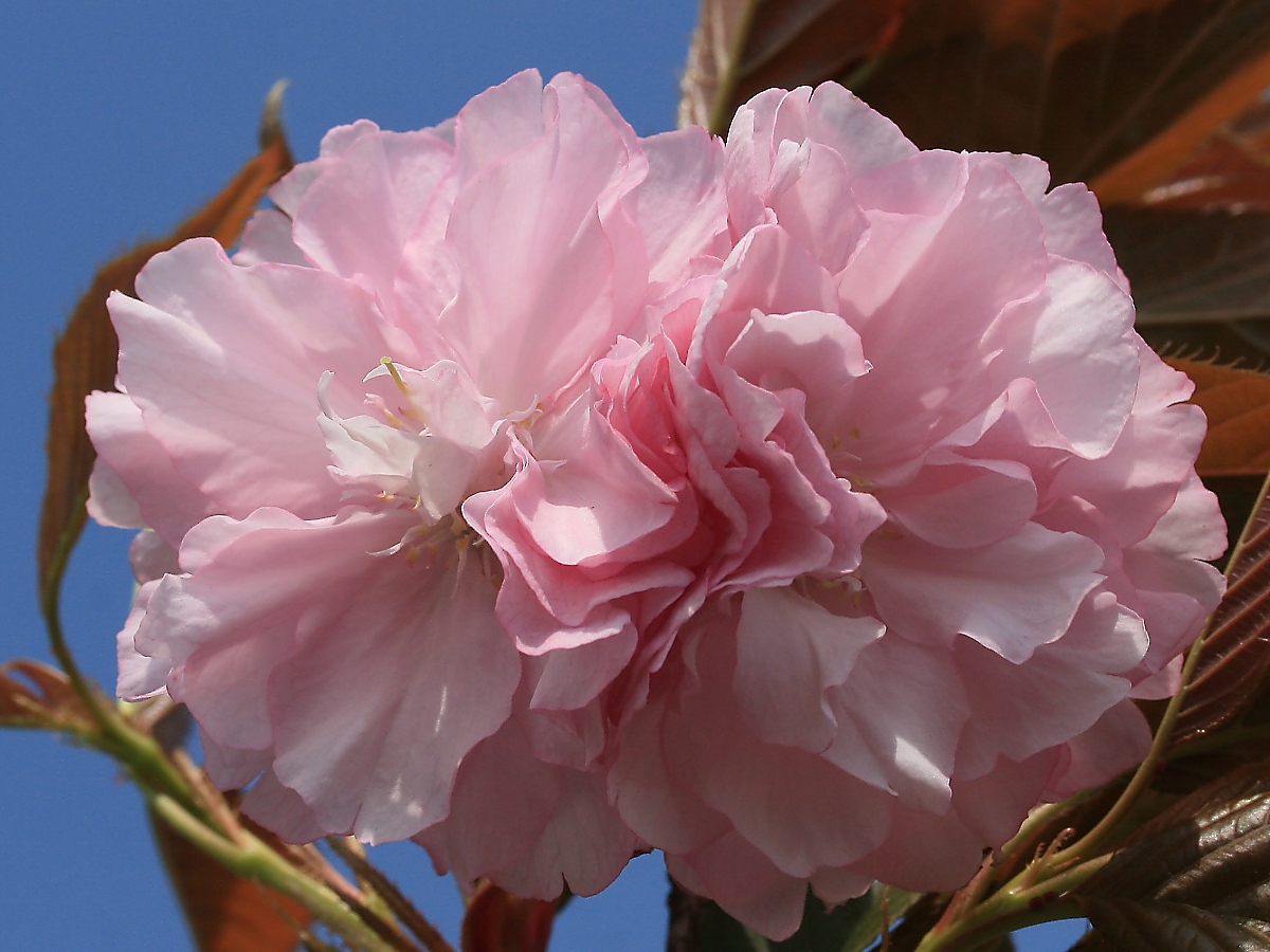 MEMO: 開花した関山で、淡紅色の八重の大輪の花は、 とても迫力が有り見ごたえのある品種である