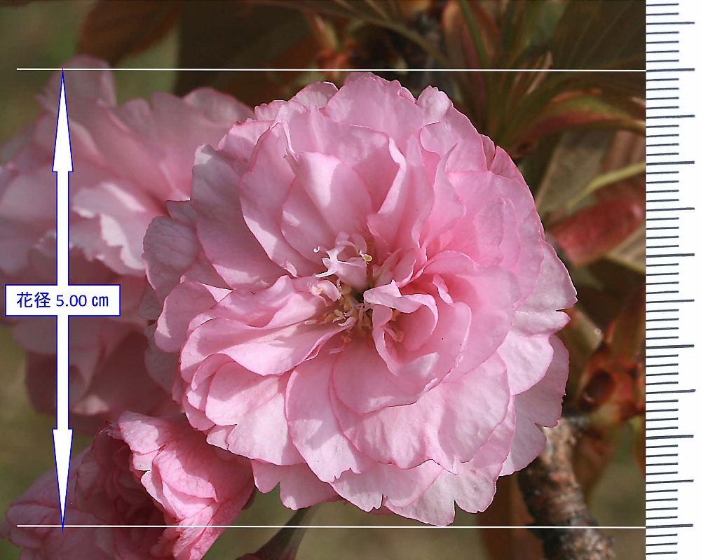 MEMO: 関山の花の直径で、花径が 5.0 ㎝と大輪で ピンク色で八重の花は優雅で見ごたえのある花である