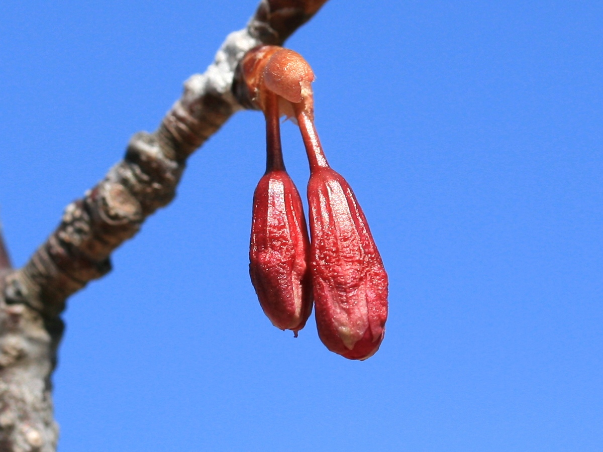 MEMO: 1個の冬芽(花芽)から2~3個のつぼみが出た寒緋桜で、 寒緋桜は萼も濃紅色で、花の色と同じであり、遠くからも目立つ