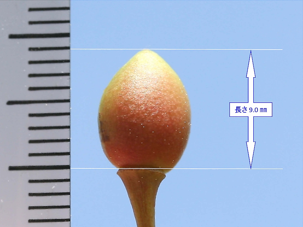 MEMO: 寒緋桜の実で、結実直後は5㎜程度だったものが、9.0 ㎜と 約2倍の大きさになり、色も黄色くなり、熟し始めてきたところ