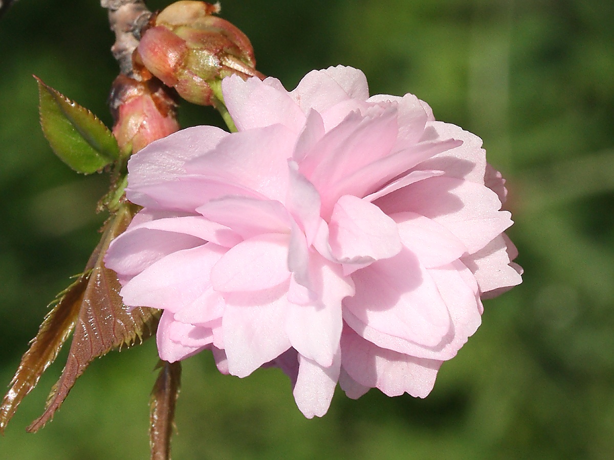 MEMO: 開花したばかりの菊枝垂で、ピンク色の菊咲きで、普通は複数の花が 塊となって咲くが、年々木が衰えており、淋しい咲き方である