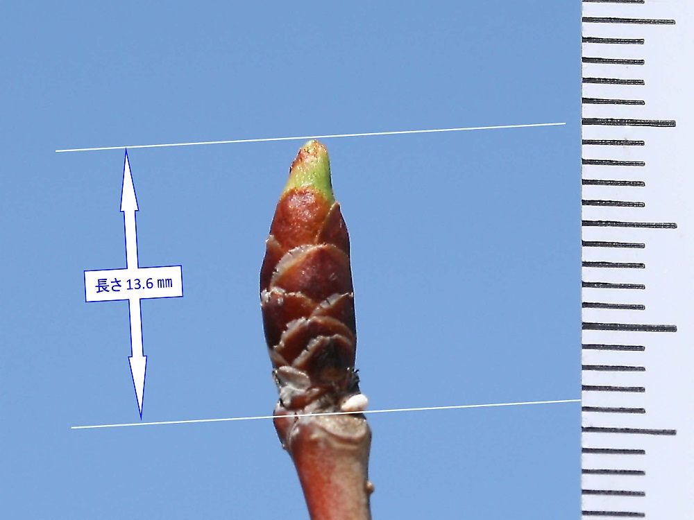 MEMO: 御衣黄の冬芽で、円錐形で、長さが 13.6 ㎜と長く 伸び、先端が割れ、淡緑色や淡紅色が見え始めたところである