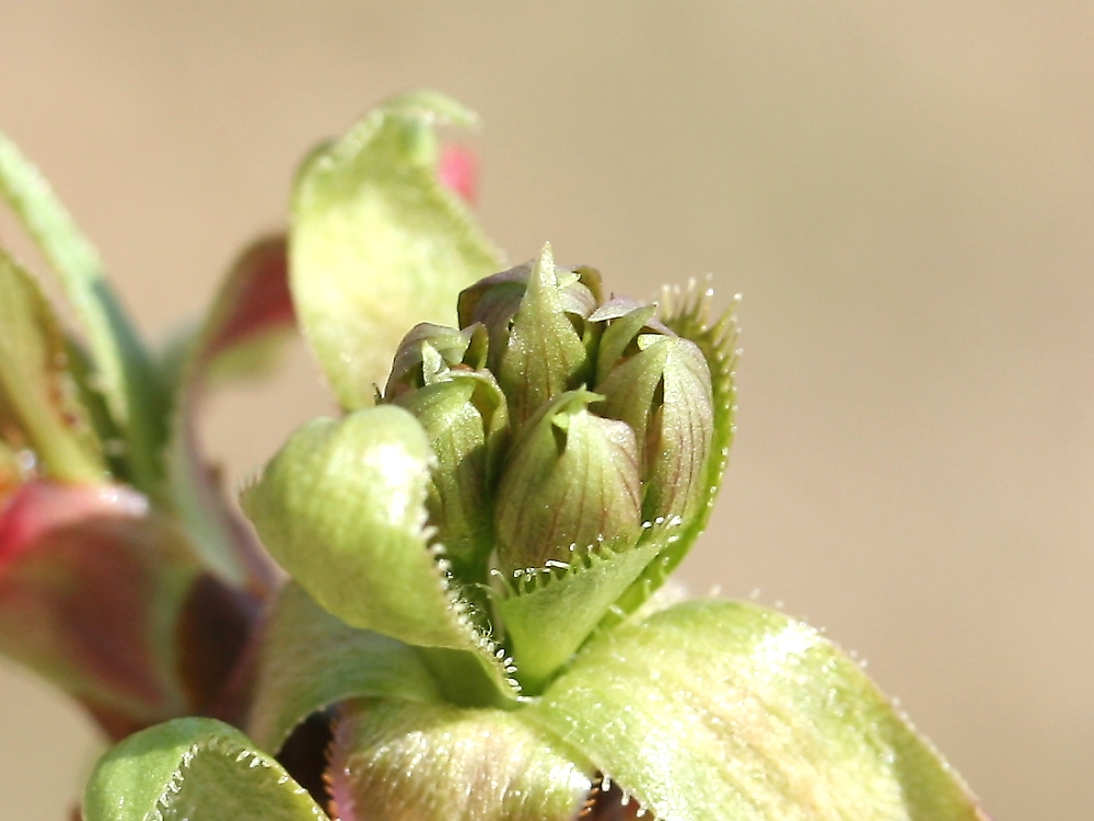 MEMO: 蕾が出始めた御衣黄の花芽で、特有の緑色の萼に 覆われたつぼみが、1個の花芽から3~4個出始めたところ