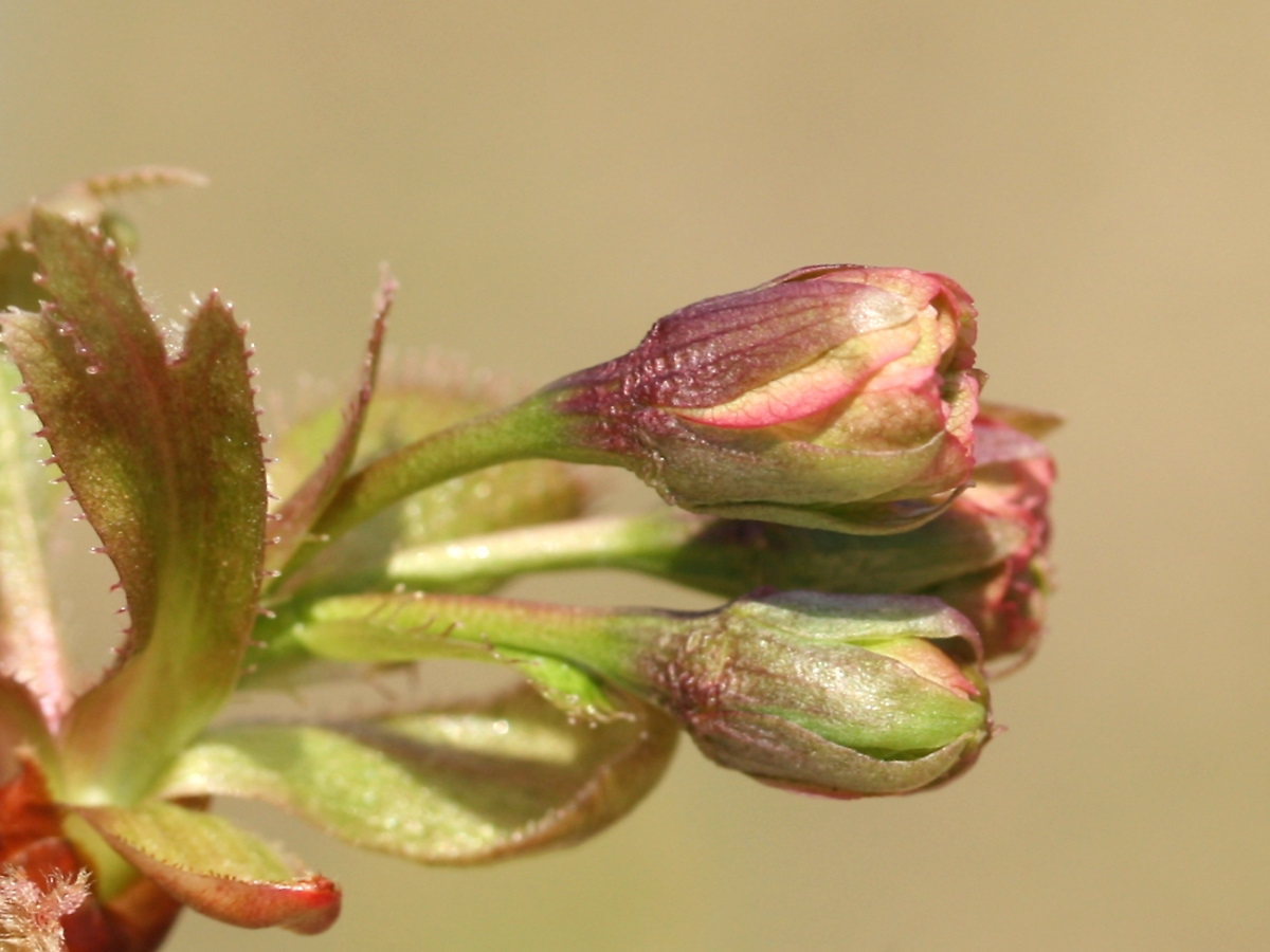 MEMO: 蕾が出た御衣黄で、出始めは緑色であった萼も茶色に変わり、 茶色っぽい花弁の縁が紅色に変わり、先端が開き御衣黄特有なつぼみである