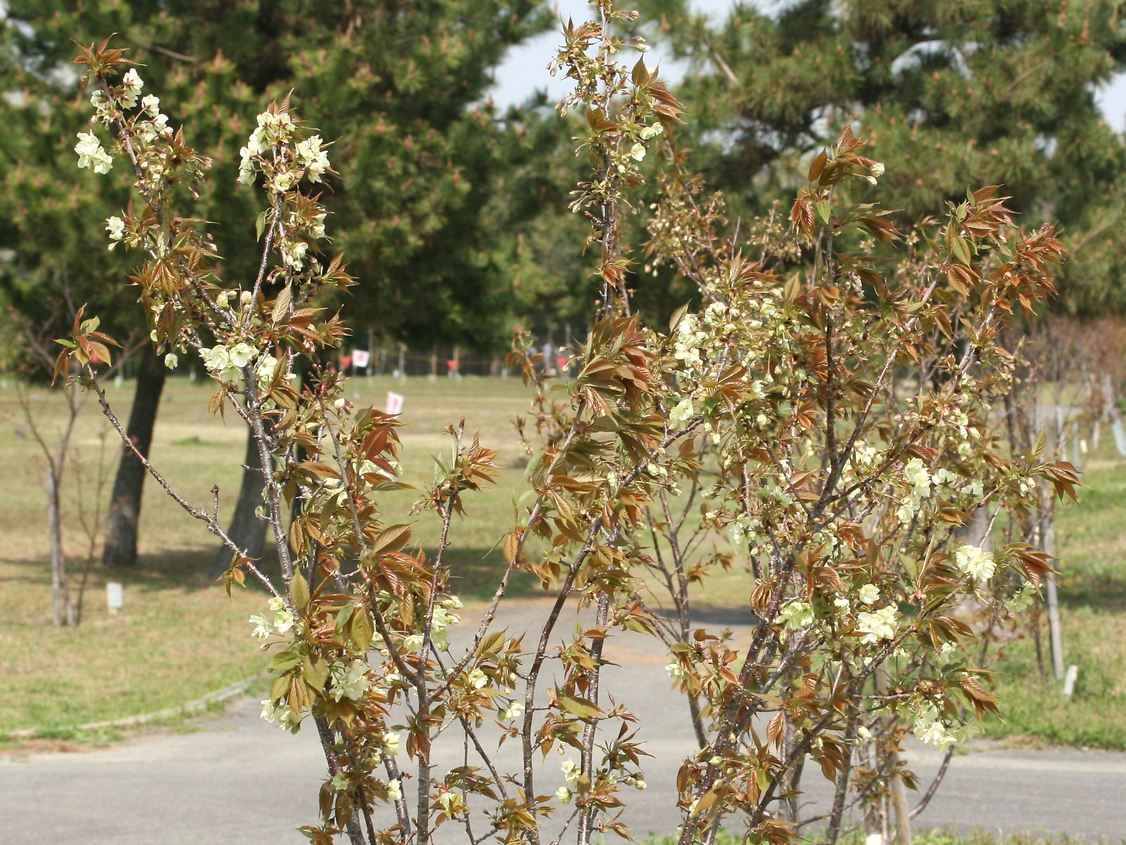MEMO: 開花したばかりの御衣黄の花姿で、開花前から出始めた 茶褐色の葉に埋もれて遠くからは咲いているようには見えない