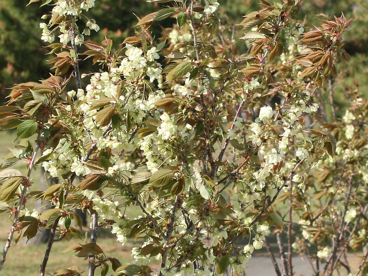 MEMO: 7分咲きの御衣黄で、今年は比較的花付が良く、若木で あるが見栄えもよく、近くで見ると珍しくて楽しい品種である