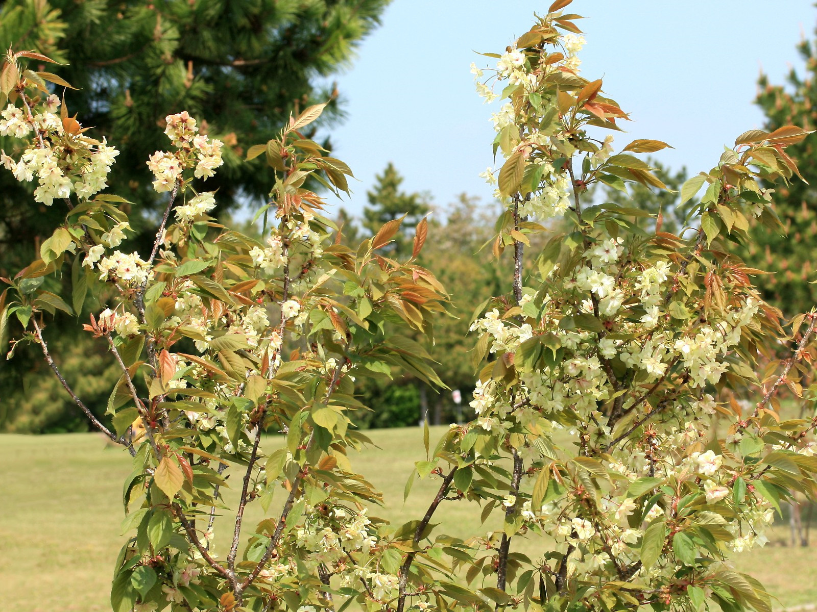 MEMO: 満開時期を迎えたた御衣黄で、花と葉が良く似た色で混在しており、 満開の状態がわかりにくいが、よく見ると全ての花が咲き揃っている