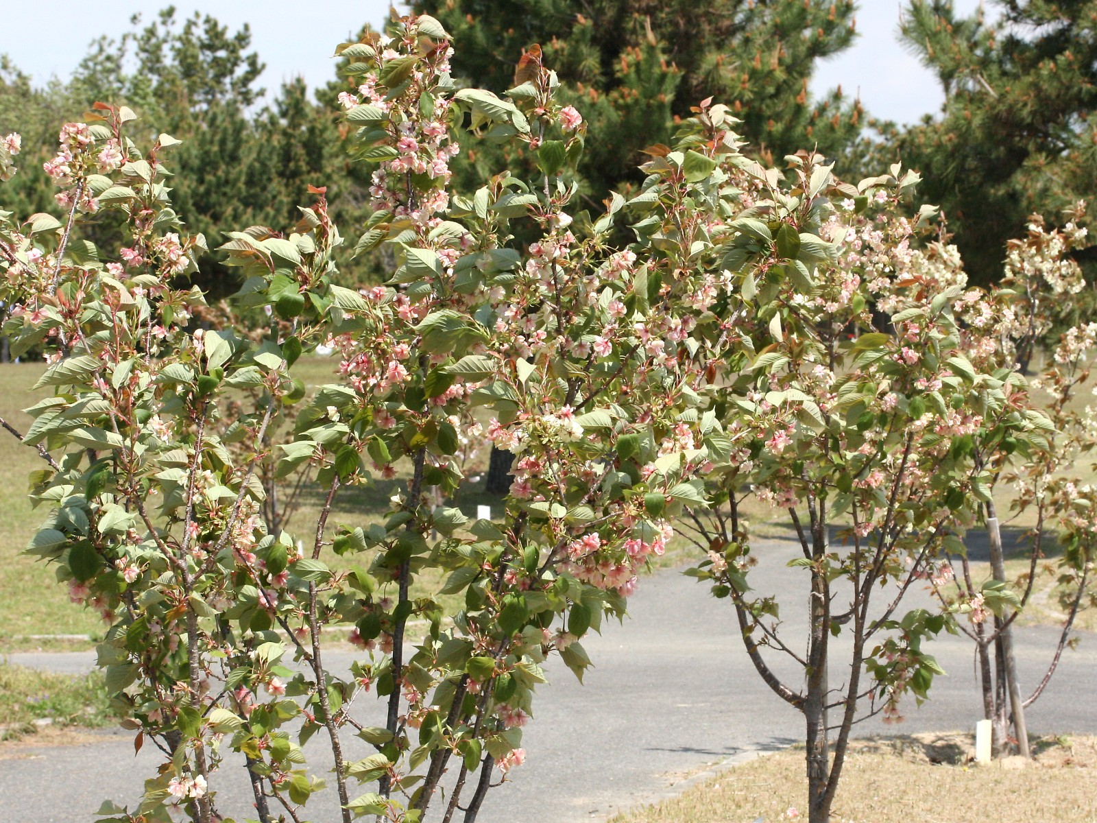 MEMO: 散り始め時期になった御衣黄で、ほとんどの花が赤みを帯びており、 花の数も少し減り始め、葉も大きく多くなり、花の時期も終わりに近づいている