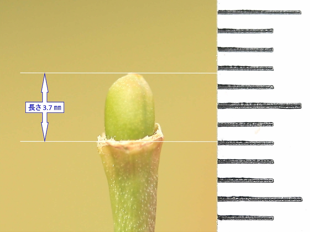 MEMO: 結実したばかりの御衣黄の実で、長さ 3.7 ㎜と非常に小さいが、 実の色が御衣黄特有の黄緑色がかった色となっているところが面白く、 初めて見る実であり、この先どこまで大きくなるか非常に興味を引かれる
