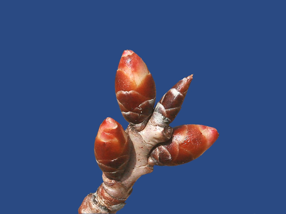 MEMO: 膨らみ始めた啓翁桜の冬芽で、芽が太くなり先端が紅色になってきた ところで、芽の形から中心の尖った芽は葉芽で、左右の3個の芽は花芽と思われる