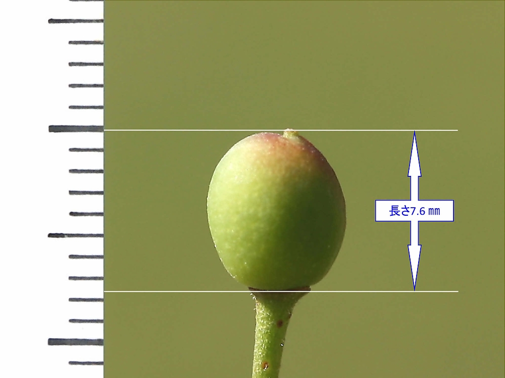 MEMO: 結実した啓翁桜の実の長さで、長さは 7.6 ㎜ となり形も丸く なっているが、木の傷みが激しく、熟すまで成長するかどうか心配である