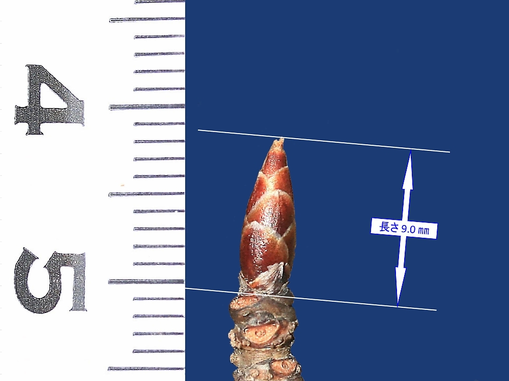 MEMO: 兼六園菊桜の冬芽で、砲弾形で、長さ 9.0 ㎜と長い品種であり、 開花時期は4月下旬~5月上旬であるため、まだまだ堅い状態である