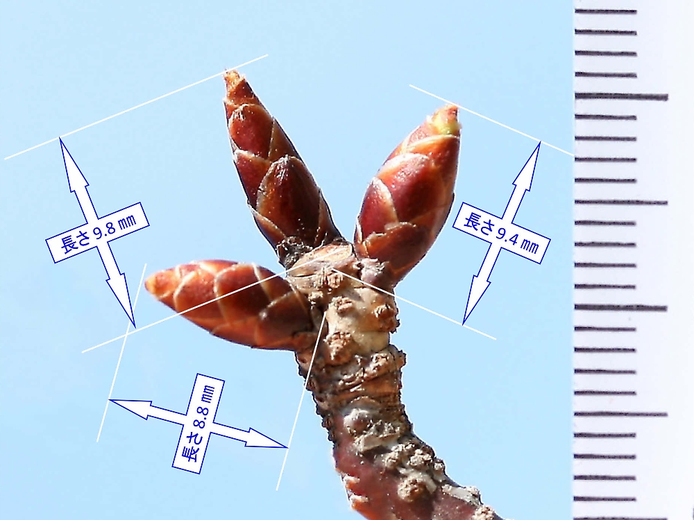 MEMO: 兼六園菊桜の冬芽で、長卵形と砲弾形で、長さは 9 ㎜程度と 伸びてはいないが、先端が割れ、淡黄緑色及び淡紅色が見え始めたところ