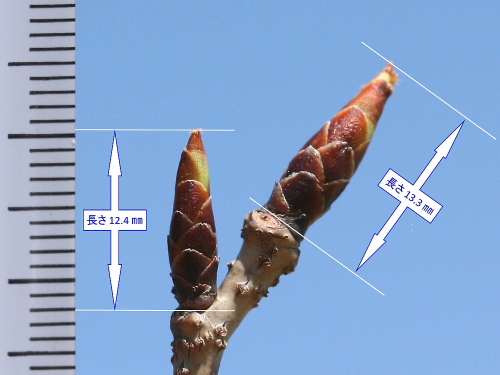 MEMO: 兼六園菊桜の冬芽で、砲弾形で、長さは 12.4 ~ 13.3 ㎜と 非常に長くなり、先端の淡黄緑色や淡紅色がはっきりしてきたところ