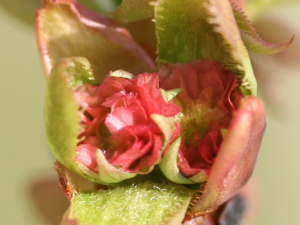 MEMO: 蕾が出始めた兼六園菊桜で、菊咲き特有のつぼみの出始めから 幾重にも重なった紅色の花弁が見え始めており、今年は期待できそうである