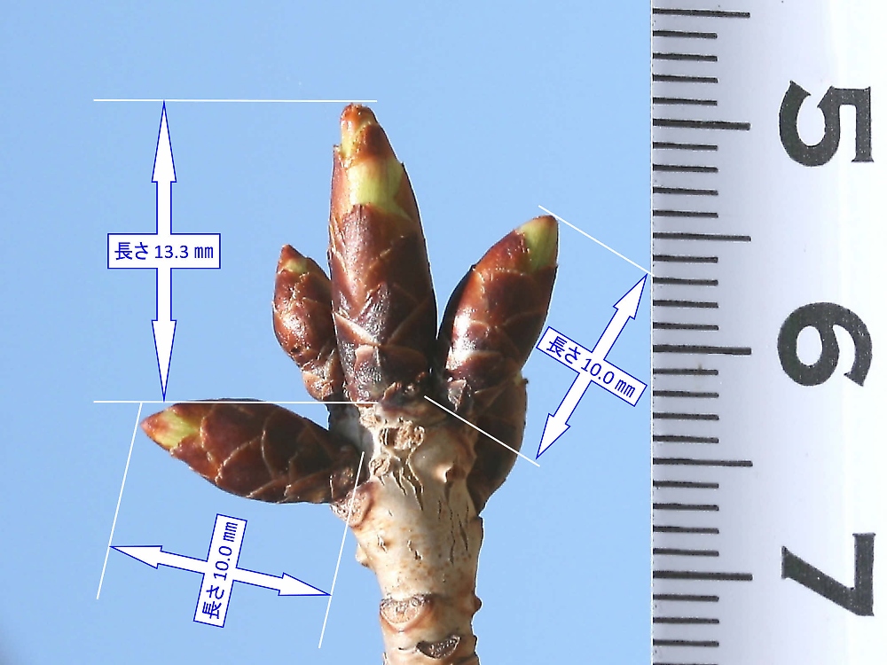 MEMO: 紅華の冬芽で、円錐形や長卵形で、長さ 10.0 ~ 13.3 ㎜と 非常に長くなり、先端の淡紅色や淡黄緑色がはっきりしてきたところ