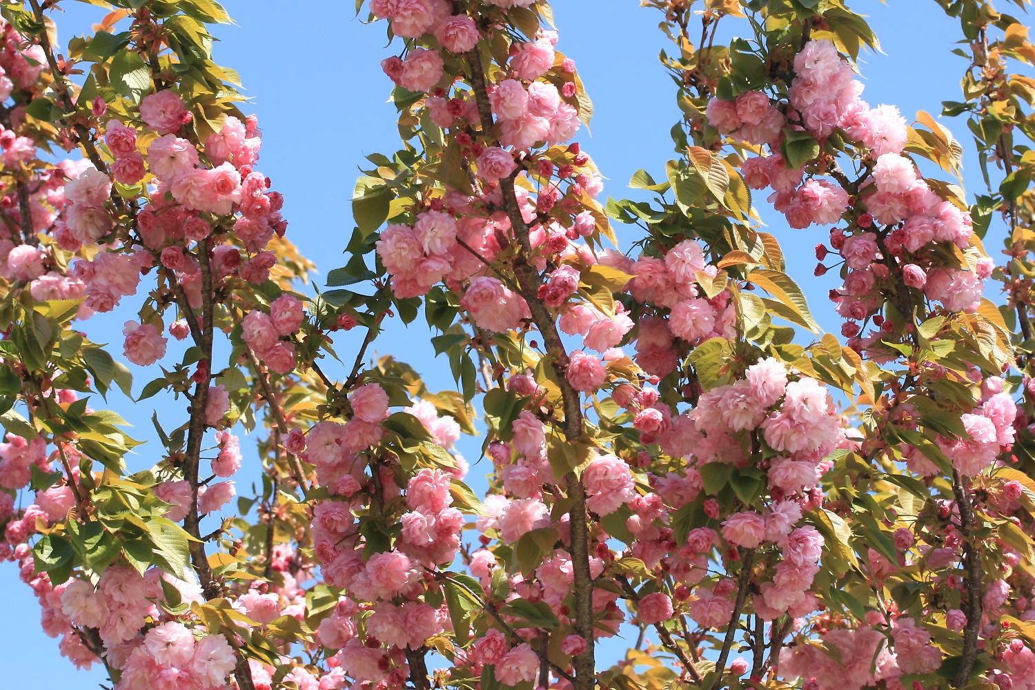 MEMO: 満開の紅華で、八重で大輪の花は重たいため、花はほとんど 下垂して咲き、下から見上げて見ると青空とのコントラストが綺麗である