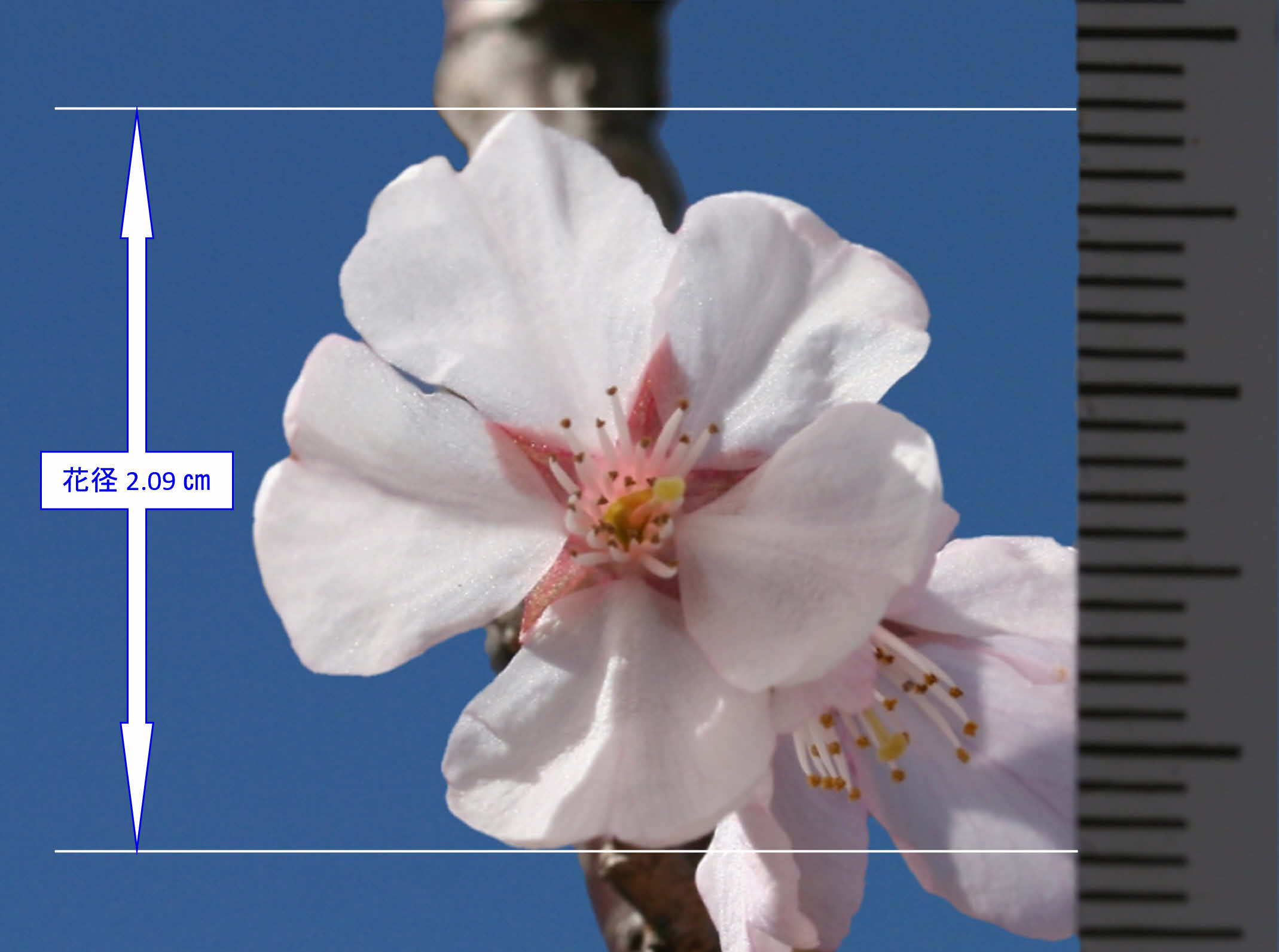MEMO: 開花して間がない小彼岸桜の直径で、約2.1㎝と小輪で、 江戸彼岸に似て、花弁は薄く弱々しいので、風により傷みやすい