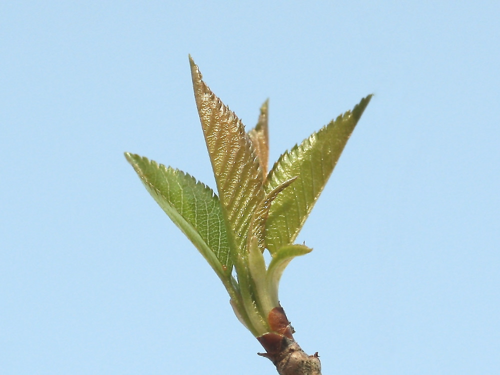 MEMO: 花時期が終了した小彼岸桜で、 この頃から薄茶色や黄緑色の若葉が出始めてくる