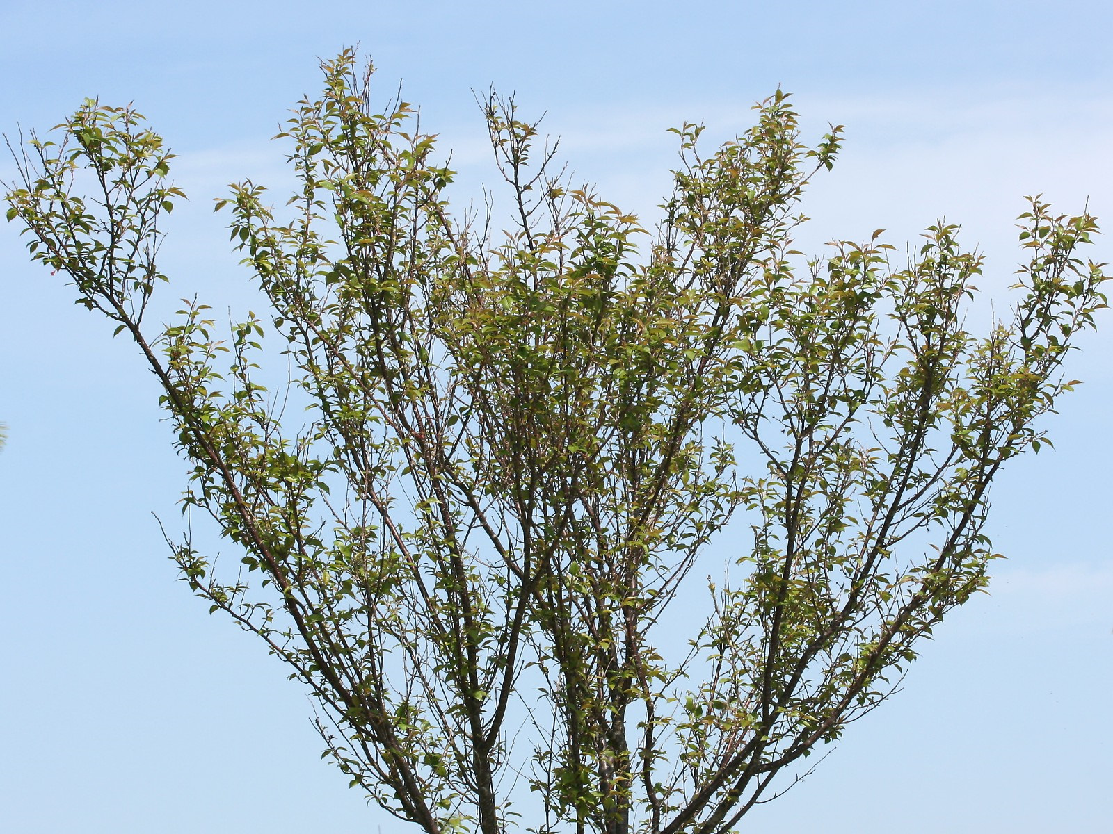MEMO: 葉桜の小彼岸桜で、小さな淡緑色の若葉で覆われた 状態であるが、木の傷みが激しく枯れた枝が目立つ