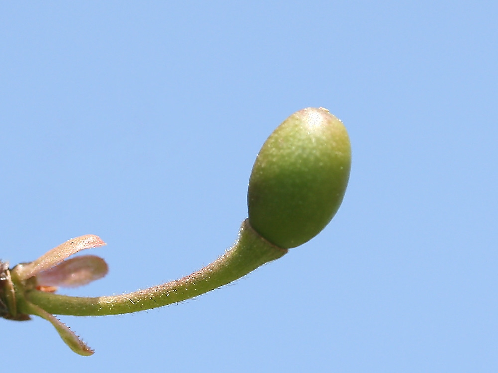 MEMO: 結実した小彼岸桜の実で、緑色の長卵形で、まだ緑色をしている 小彼岸桜の結実は初めてであり、この先どこまで成長するか楽しみである