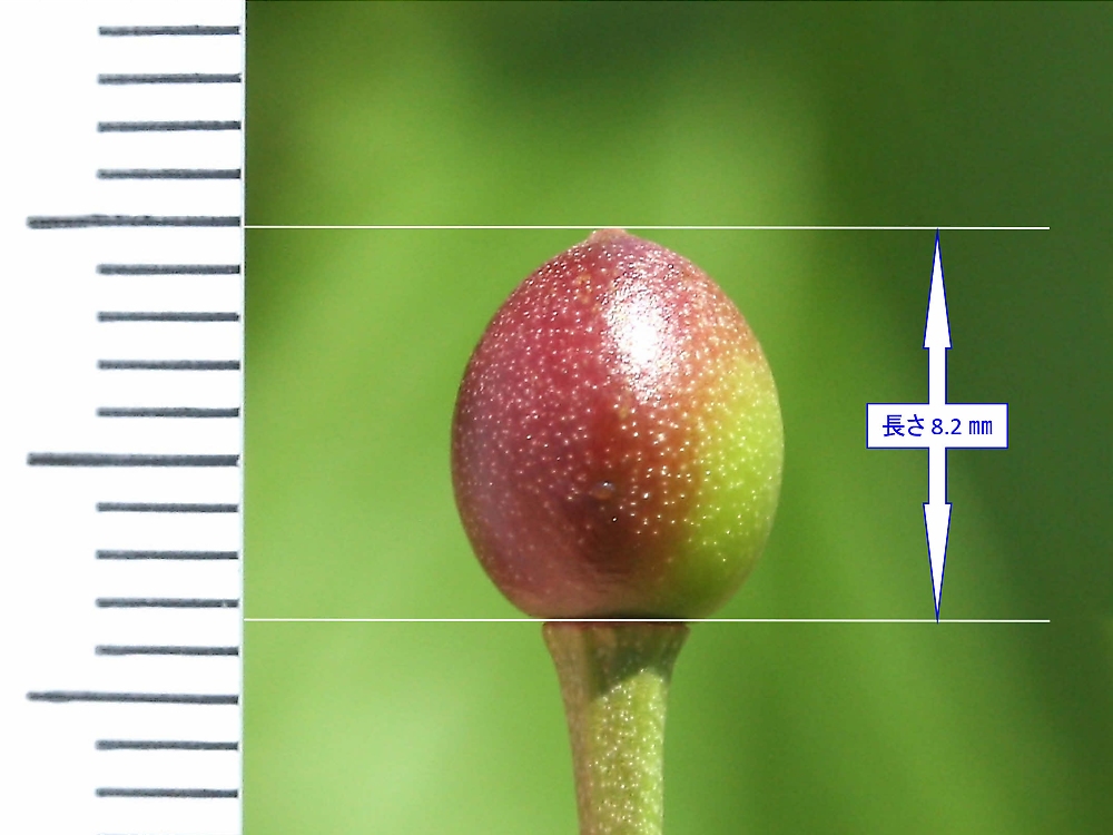 MEMO: 佐野桜の実の長さで、長さ 8.2 ㎜とやや大きめで、 赤い色が付き始めており、熟し始めてきたと思われる