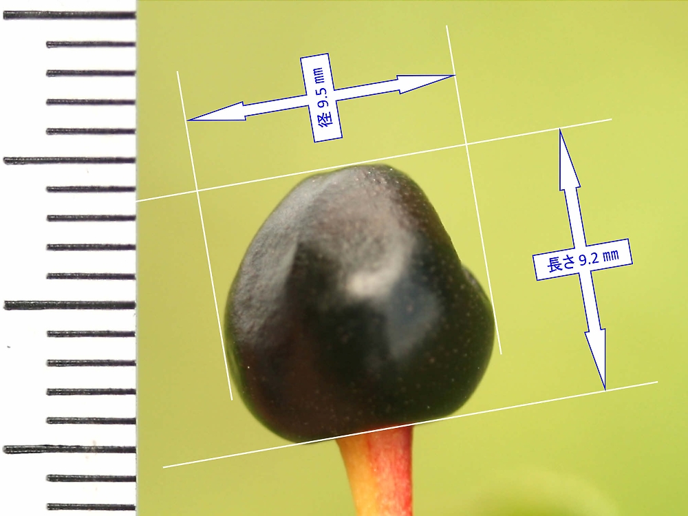 MEMO: 佐野桜の実の大きさで、長さが 9.2 ㎜で、径が 9.5 ㎜(長さの103%) と、径のほうが大きく完熟(黒熟)実であり、初めて完熟実を見れて嬉しい