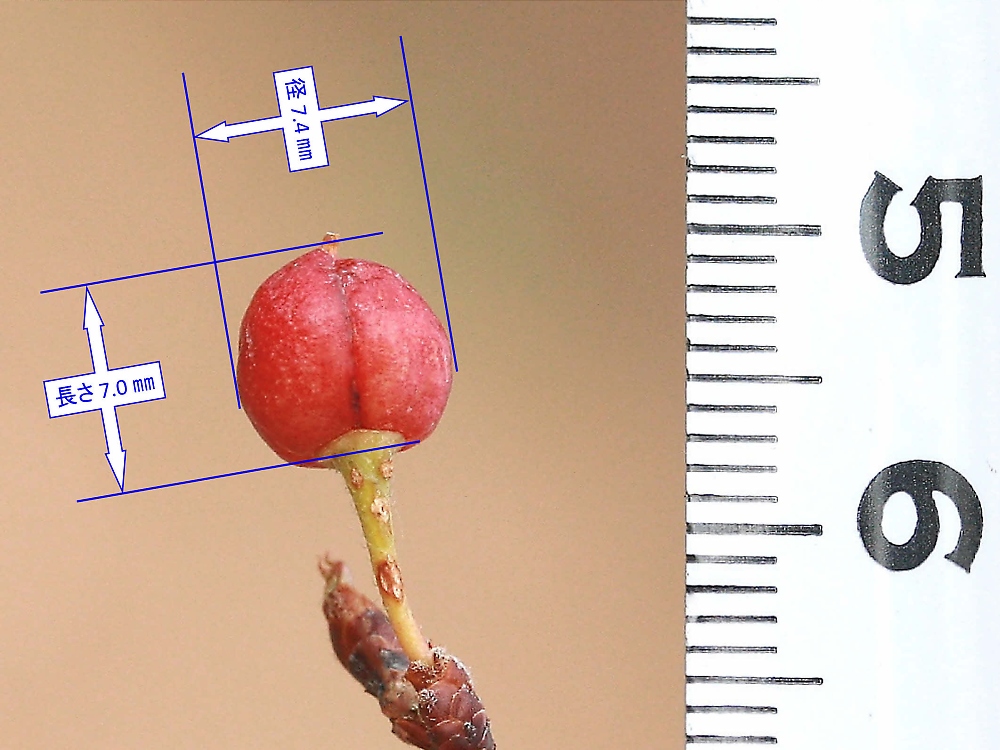 MEMO: ニ季咲き四季桜の秋咲きの果実で、球形で、大きさ 7.0 × 7.4 ㎜、 赤熟し始めた状態で、表面はやや凸凹があり、縦に溝が有るのが特徴である